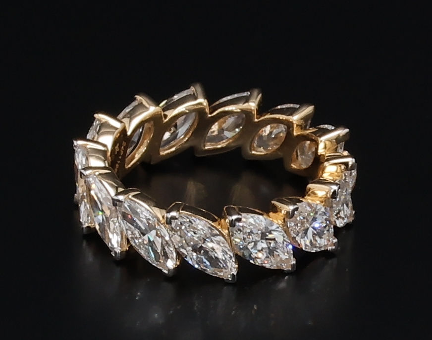 Crafted with precision,this exquisite eternity band features 4.50 carats of marquise-cut lab grown diamonds, beautifully set in luminous 14 kt gold. A striking piece to honour life's grand celebrations or simply indulge in everyday luxury.